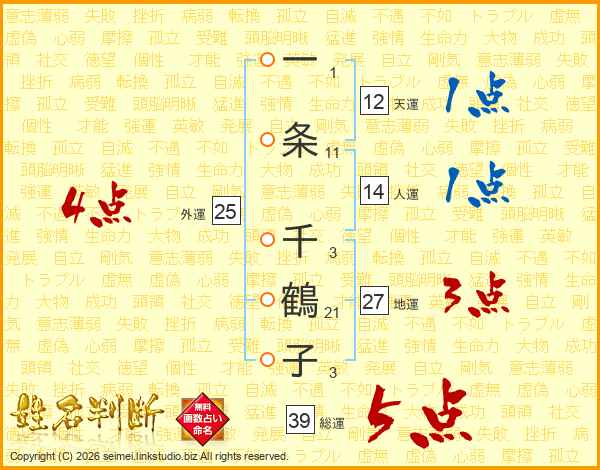一(1画)条(11画) 千(3画)鶴(21画)子(3画)