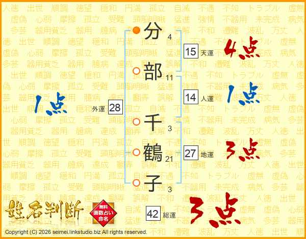 分(4画)部(11画) 千(3画)鶴(21画)子(3画)