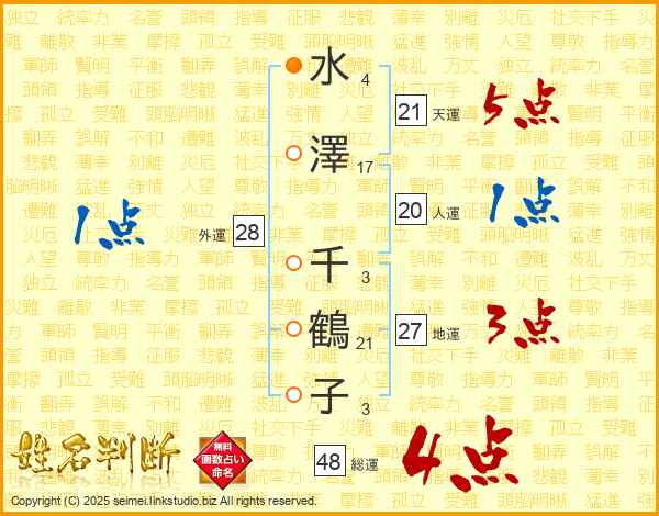 水(4画)澤(17画) 千(3画)鶴(21画)子(3画)