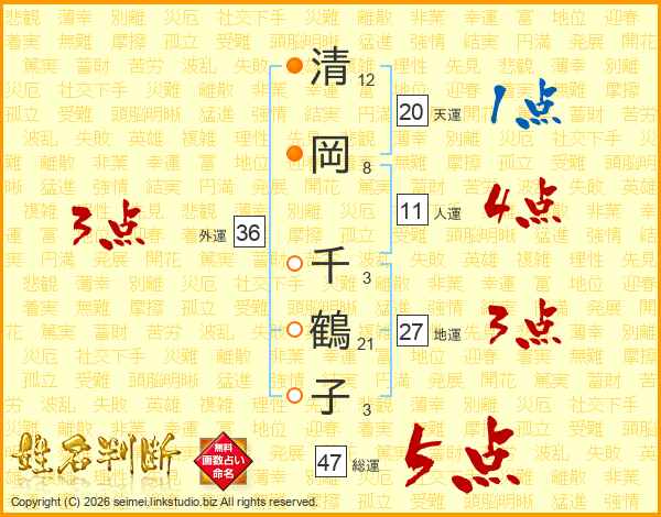 清(12画)岡(8画) 千(3画)鶴(21画)子(3画)