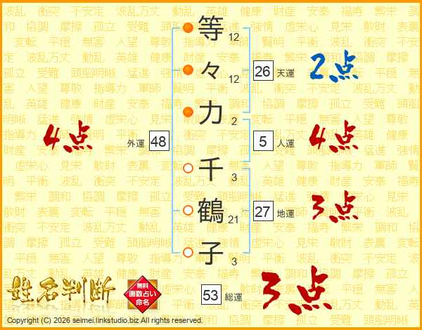 等(12画)々(12画)力(2画) 千(3画)鶴(21画)子(3画)