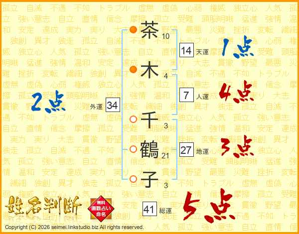 茶(10画)木(4画) 千(3画)鶴(21画)子(3画)
