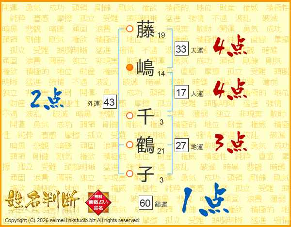 藤(19画)嶋(14画) 千(3画)鶴(21画)子(3画)