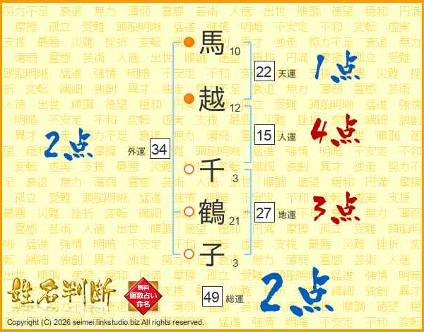 馬(10画)越(12画) 千(3画)鶴(21画)子(3画)