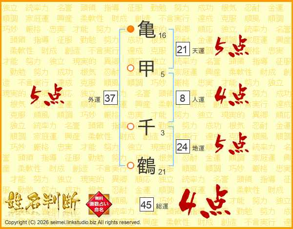 亀(16画)甲(5画) 千(3画)鶴(21画)