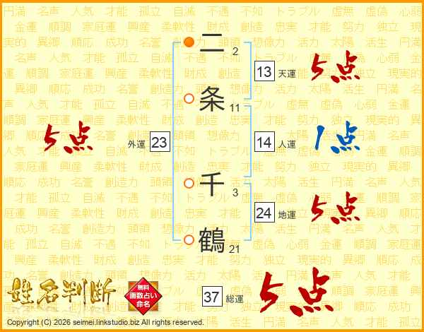 二条千鶴さんの総運は37画の5点!