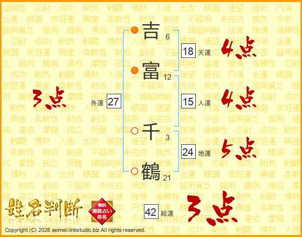 吉(6画)富(12画) 千(3画)鶴(21画)