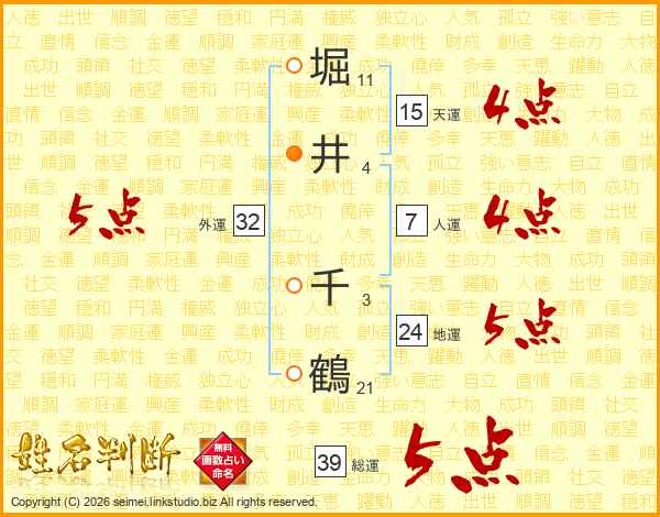 堀井千鶴さんの総運は39画の5点!