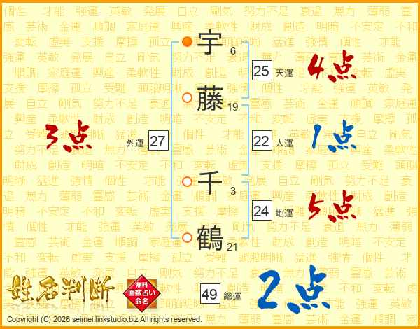 宇(6画)藤(19画) 千(3画)鶴(21画)