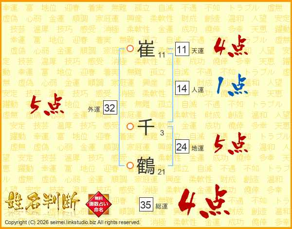 崔(11画) 千(3画)鶴(21画)