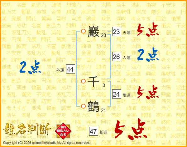 生活面を象徴する運勢です。外部から受ける影響力を表し、結婚運、家庭運や職場、環境への順応性を表します。総運から人運を引いた画数。姓や名が1文字の場合を除く。