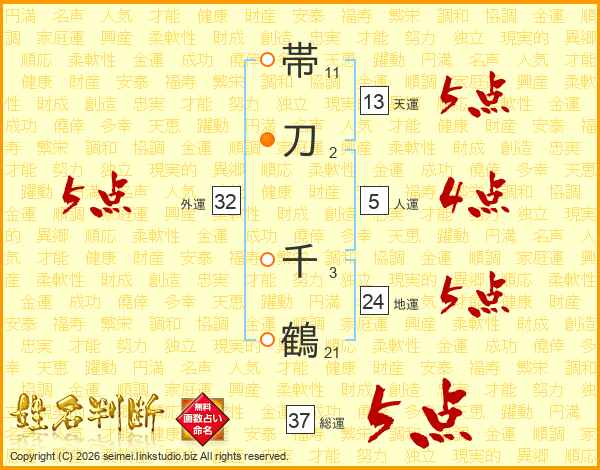 帯刀千鶴さんの総運は37画の5点!