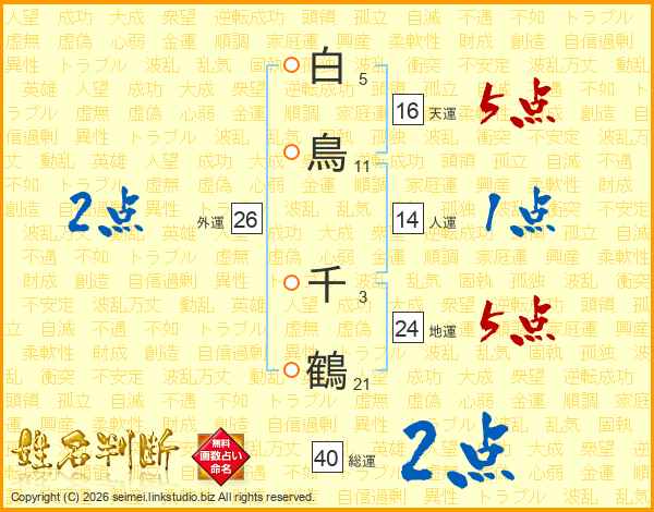 白(5画)鳥(11画) 千(3画)鶴(21画)