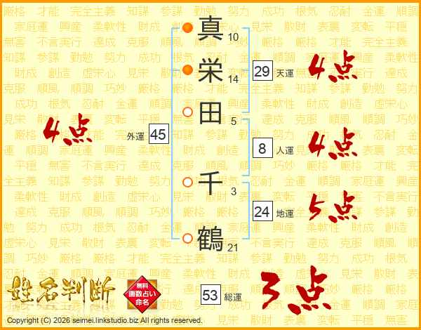 真(10画)栄(14画)田(5画) 千(3画)鶴(21画)