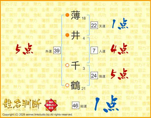 薄(18画)井(4画) 千(3画)鶴(21画)