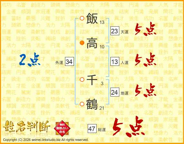 飯(13画)高(10画) 千(3画)鶴(21画)