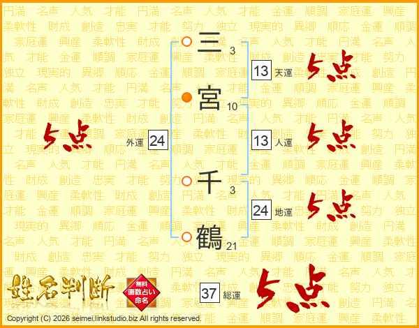三宮千鶴さんの総運は37画の5点!