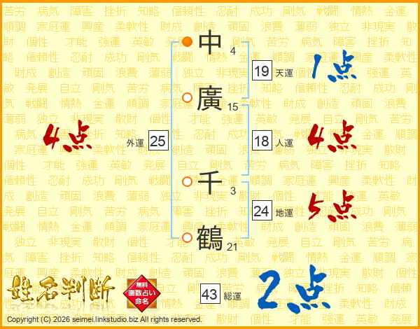 中廣千鶴さんの総運は43画の2点!