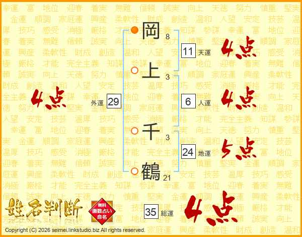岡(8画)上(3画) 千(3画)鶴(21画)