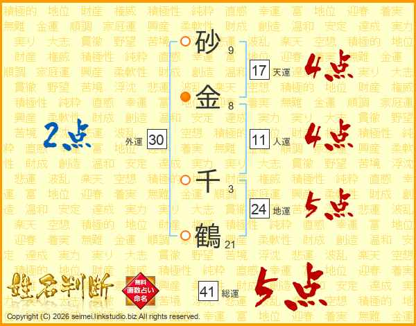 砂(9画)金(8画) 千(3画)鶴(21画)