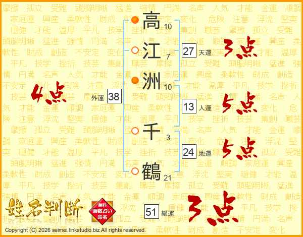 高(10画)江(7画)洲(10画) 千(3画)鶴(21画)