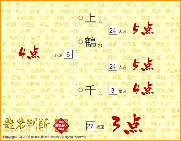 生活面を象徴する運勢です。外部から受ける影響力を表し、結婚運、家庭運や職場、環境への順応性を表します。総運から人運を引いた画数。姓や名が1文字の場合を除く。