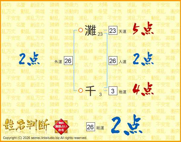 生活面を象徴する運勢です。外部から受ける影響力を表し、結婚運、家庭運や職場、環境への順応性を表します。総運から人運を引いた画数。姓や名が1文字の場合を除く。