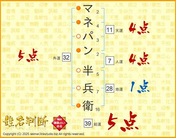 マ(2画)ネ(4画)パ(3画)ン(2画) 半(5画)兵(7画)衛(16画)