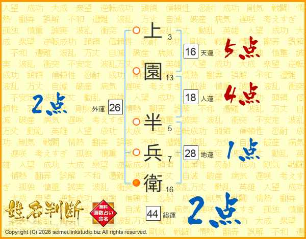 上(3画)園(13画) 半(5画)兵(7画)衛(16画)