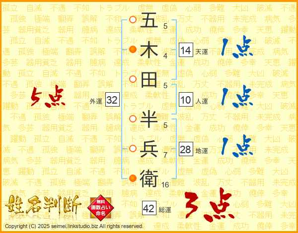 五(5画)木(4画)田(5画) 半(5画)兵(7画)衛(16画)