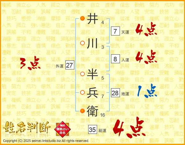 井(4画)川(3画) 半(5画)兵(7画)衛(16画)