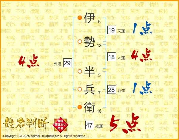 伊(6画)勢(13画) 半(5画)兵(7画)衛(16画)