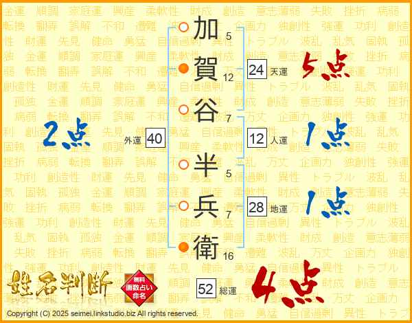 加(5画)賀(12画)谷(7画) 半(5画)兵(7画)衛(16画)