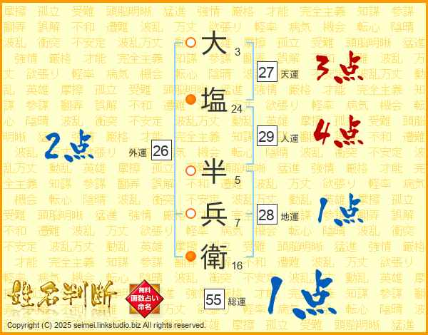 大(3画)塩(24画) 半(5画)兵(7画)衛(16画)