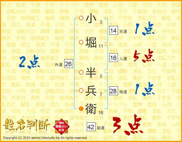 小(3画)堀(11画) 半(5画)兵(7画)衛(16画)