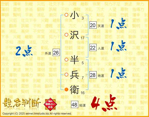 小(3画)沢(17画) 半(5画)兵(7画)衛(16画)