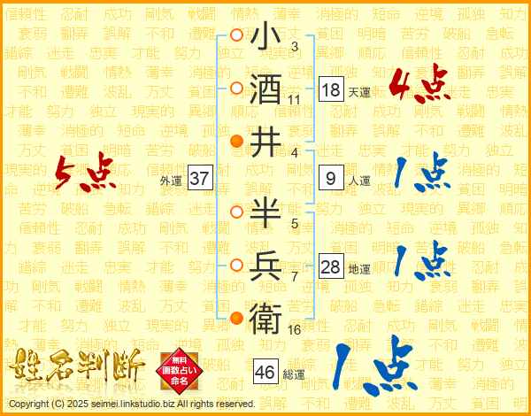 小(3画)酒(11画)井(4画) 半(5画)兵(7画)衛(16画)