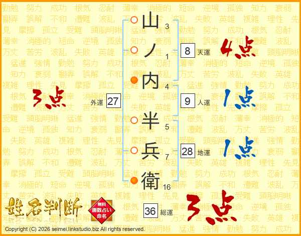 山(3画)ノ(1画)内(4画) 半(5画)兵(7画)衛(16画)