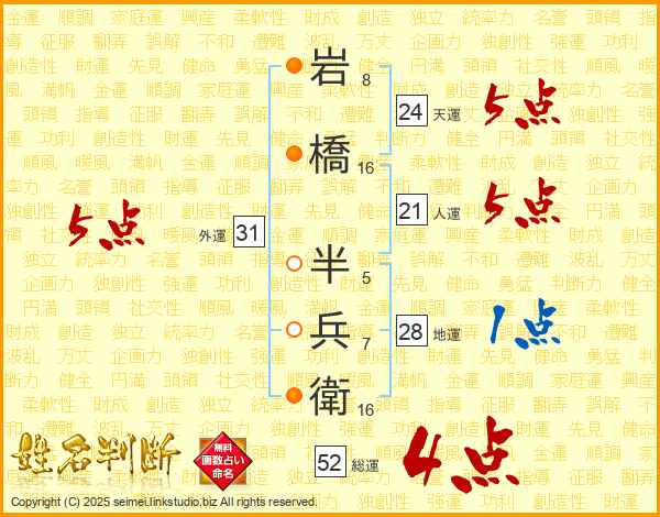 岩(8画)橋(16画) 半(5画)兵(7画)衛(16画)