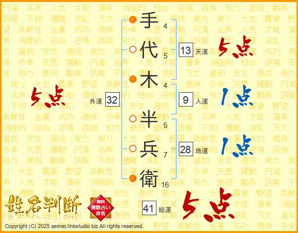 手(4画)代(5画)木(4画) 半(5画)兵(7画)衛(16画)