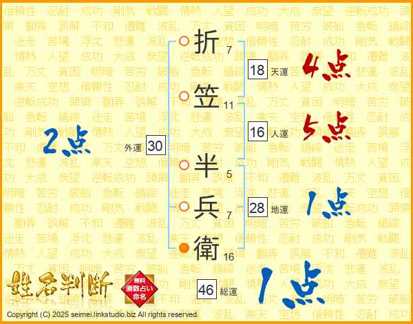 折(7画)笠(11画) 半(5画)兵(7画)衛(16画)