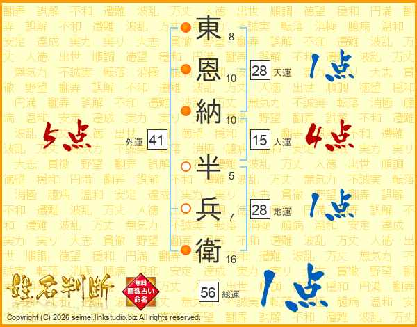 東(8画)恩(10画)納(10画) 半(5画)兵(7画)衛(16画)