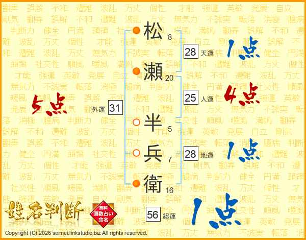 松(8画)瀬(20画) 半(5画)兵(7画)衛(16画)