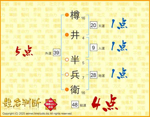 樽(16画)井(4画) 半(5画)兵(7画)衛(16画)