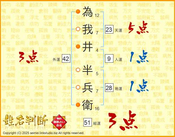 為(12画)我(7画)井(4画) 半(5画)兵(7画)衛(16画)