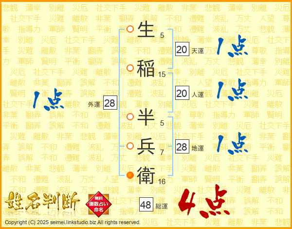 生(5画)稲(15画) 半(5画)兵(7画)衛(16画)