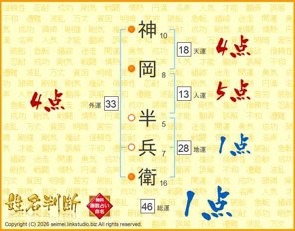 神(10画)岡(8画) 半(5画)兵(7画)衛(16画)
