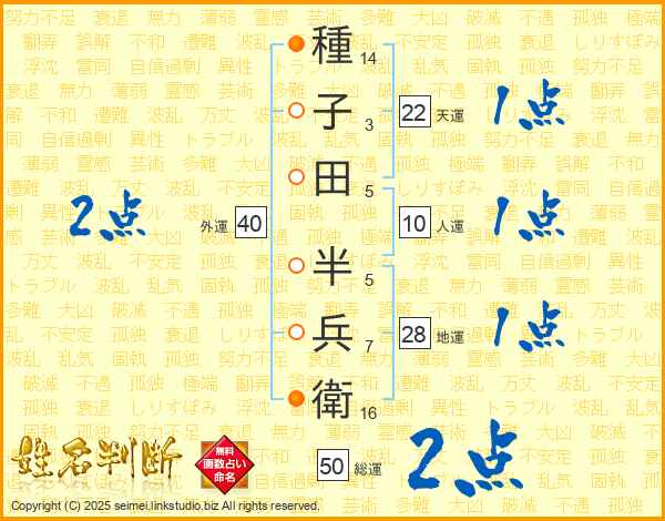 種(14画)子(3画)田(5画) 半(5画)兵(7画)衛(16画)
