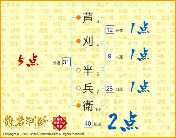 芦(8画)刈(4画) 半(5画)兵(7画)衛(16画)