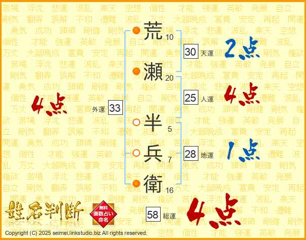 荒(10画)瀬(20画) 半(5画)兵(7画)衛(16画)